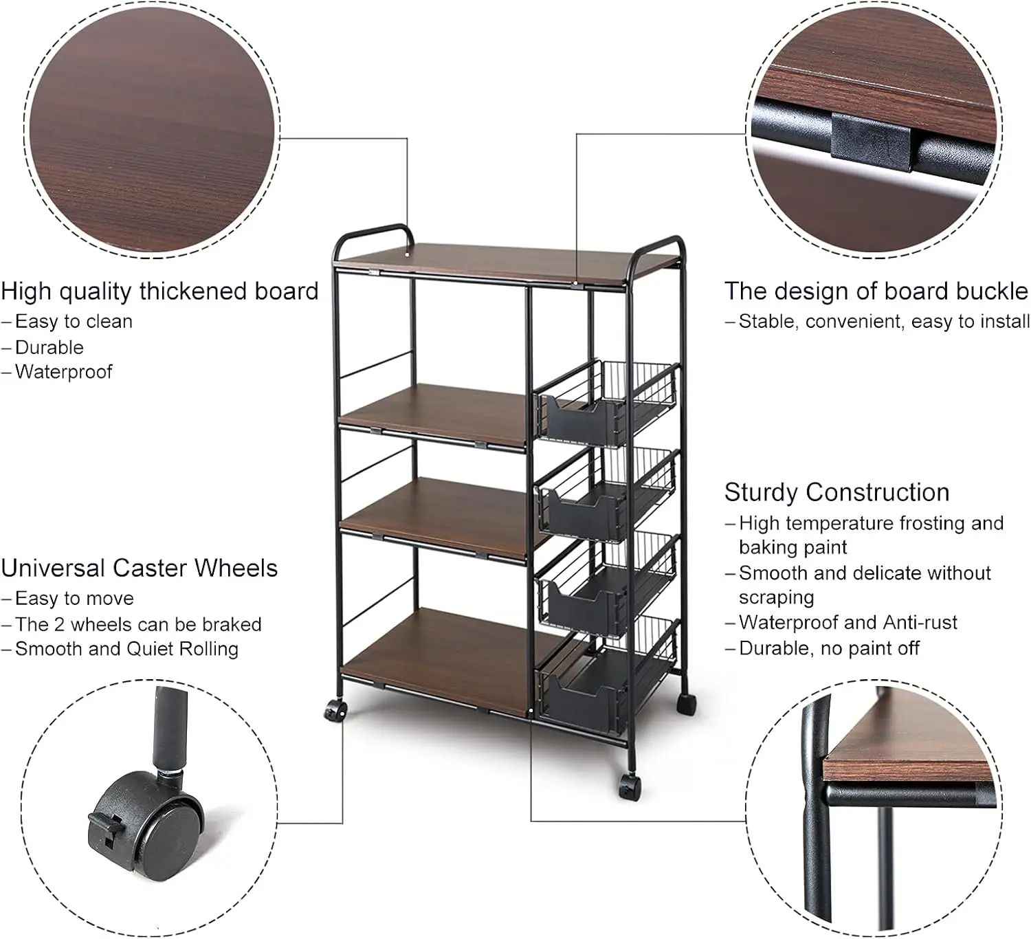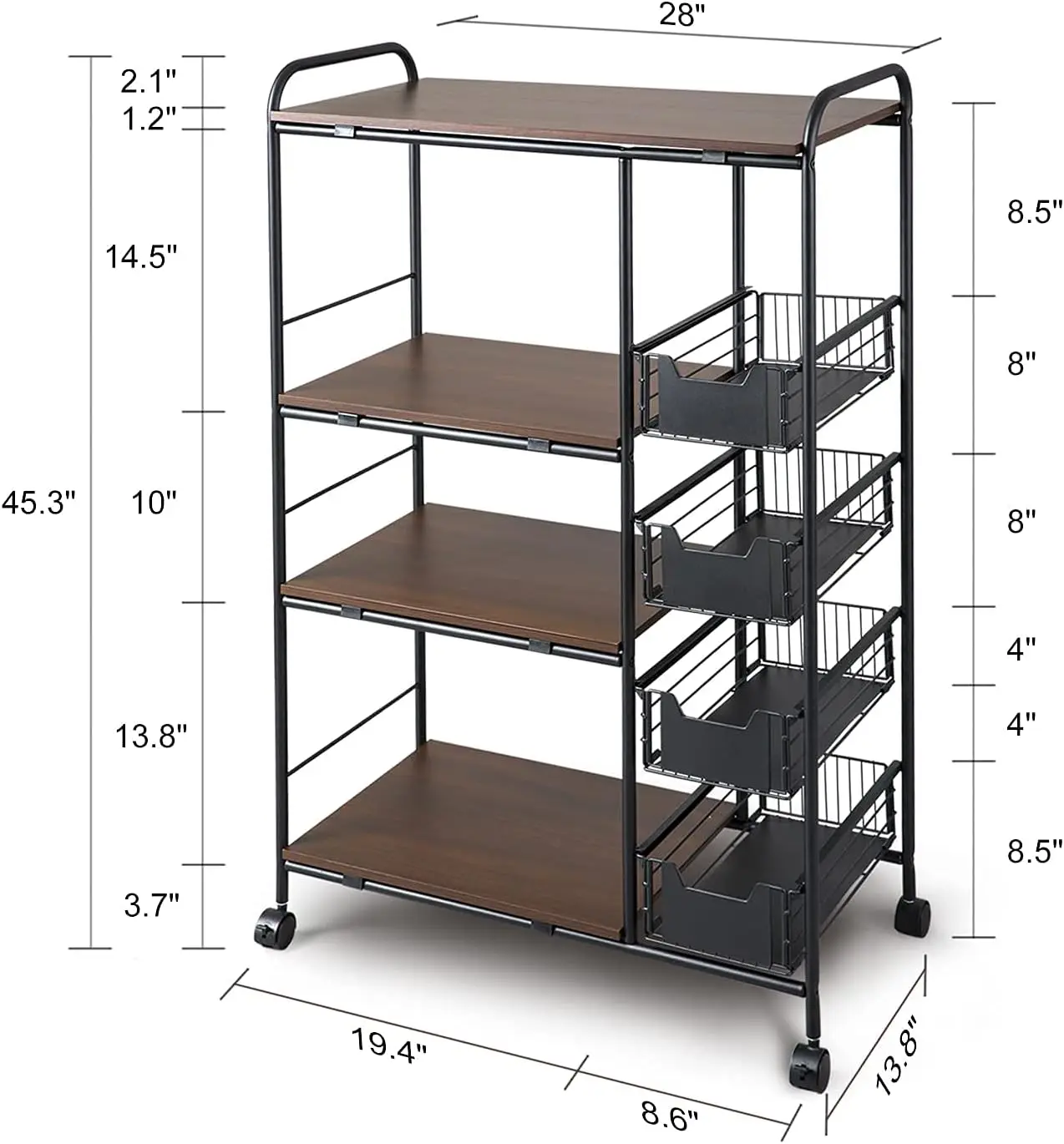 - 【Tidy & Clean】: 4 tier board for placing microwave oven, toaster, fryers, etc. 4 storage baskets for fruits, vegetables, jars, utensils, etc. Tiered design, tidier.